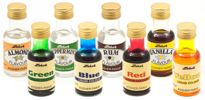 Available in 1 fl.oz glass bottles in four colours – red, green, blue and yellow, and four flavours – vanilla, rum, almond and peppermint.