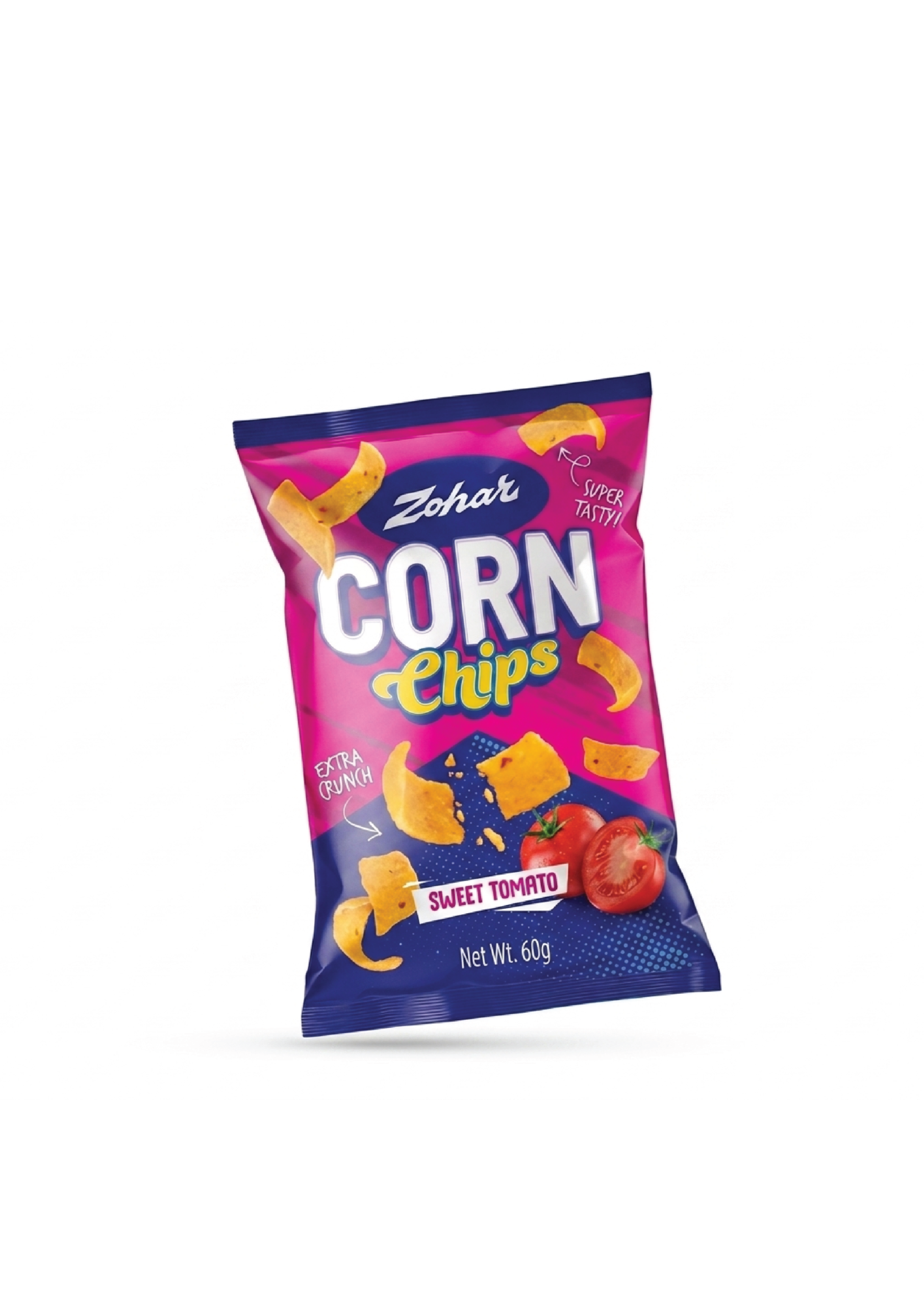 Crispy corn chips with a subtly sweet and tangy tomato seasoning, perfect for a tasty, distinctive snack.